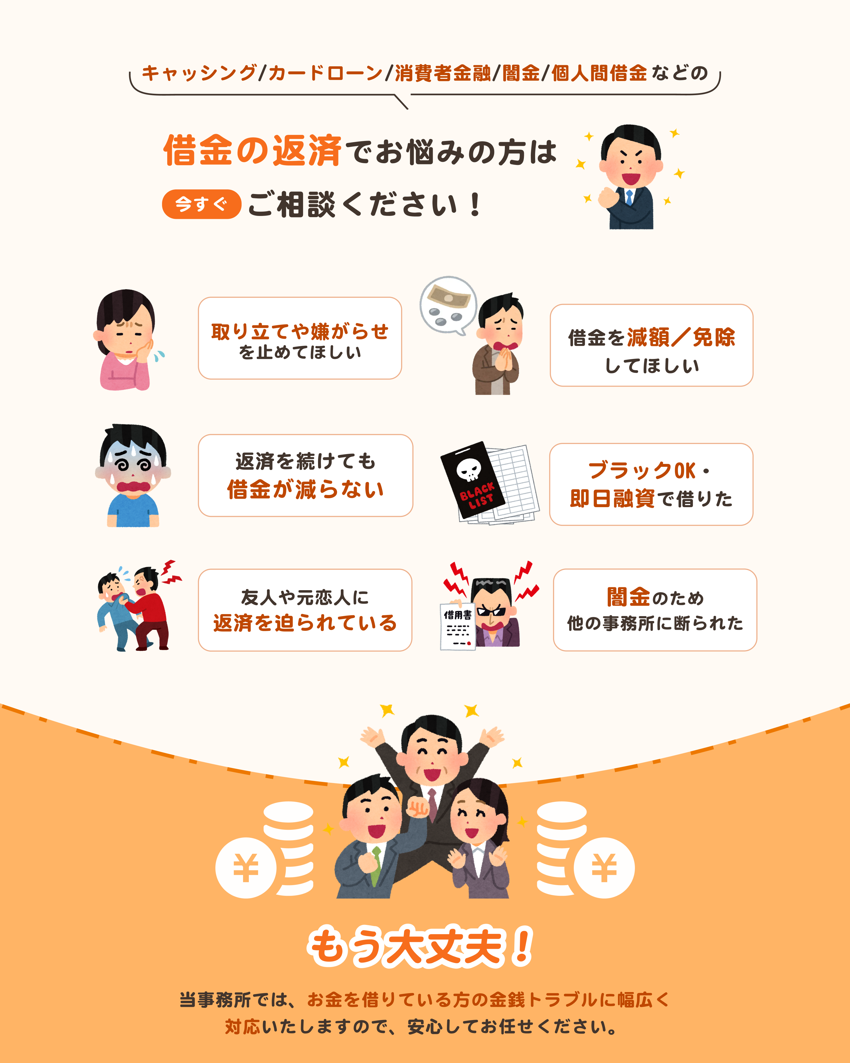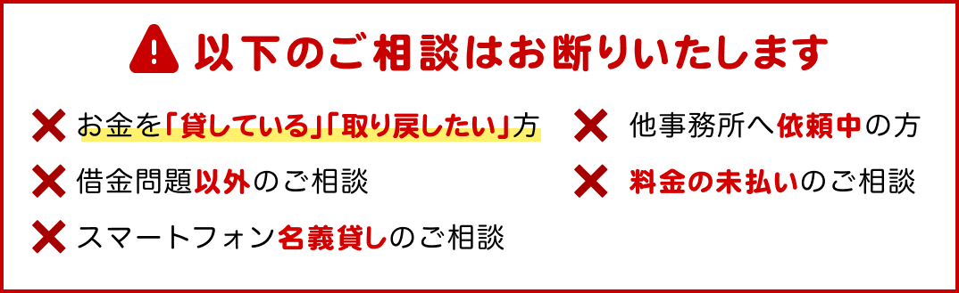 現在は催促などもなくなり、すっきりです。※表記の解決イメージないし事例は、過去の取り扱い事件を元に依頼者の特定を防止するため一部抽象化しております。