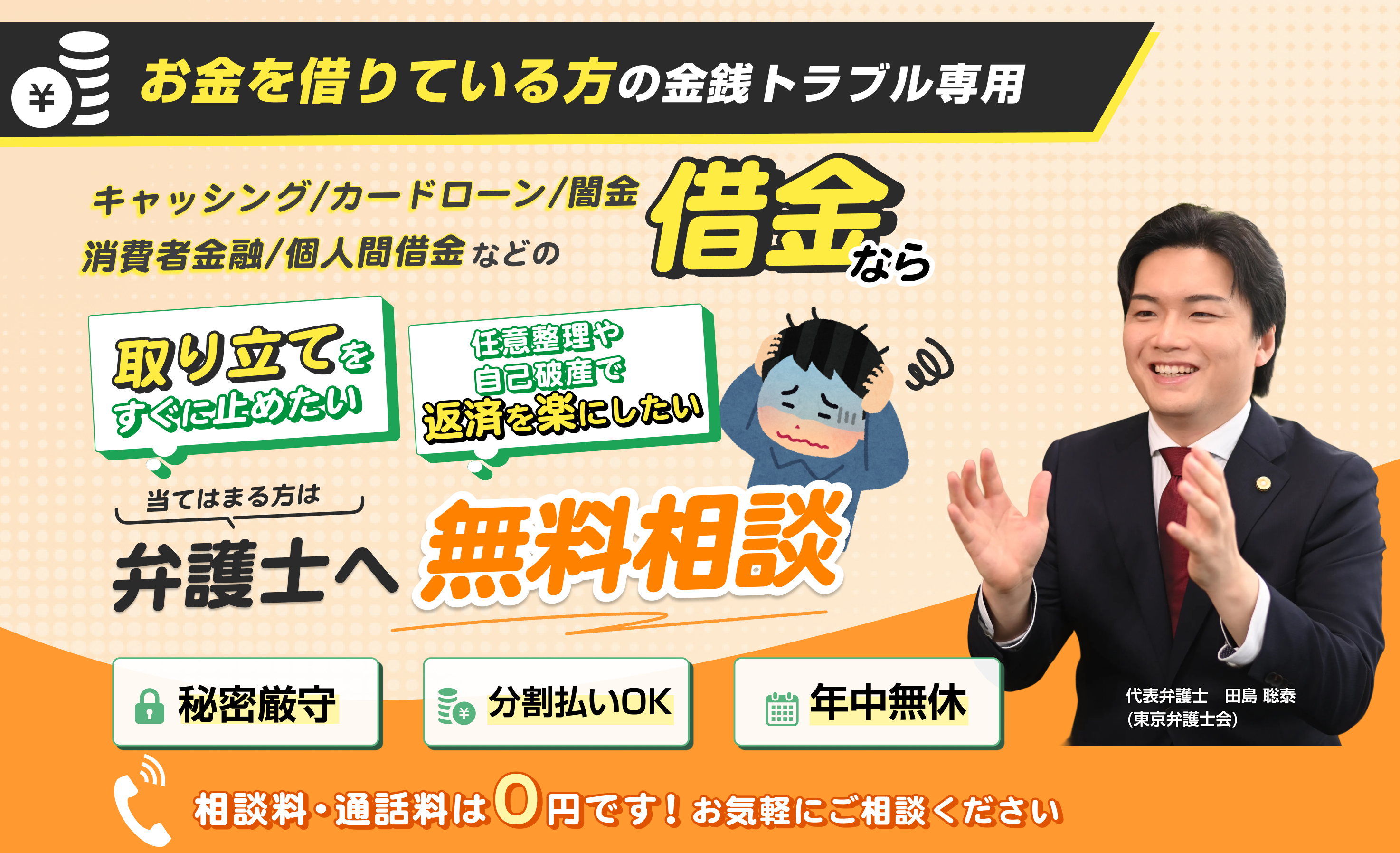 無料相談では、話しづらいと思っていた闇金のこともスムーズに話すことができました。無事に解決し、闇金への恐怖から解放されて気持ちが晴れ晴れとしています。※表記の解決イメージないし事例は、過去の取り扱い事件を元に依頼者の特定を防止するため一部抽象化しております。